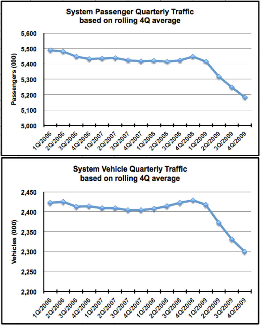 – Significantly, there were traffic gains of 2% for passengers and 3% for vehicles in January 2009. January is traditionally a low volume month, with very little discretionary traffic (minimal tourist and part-time resident travel). Even with severely limited discretionary travel, the fare incentive was sufficient to raise the year-over-year monthly traffic well above the results seen through the rest of the year. We believe these gains are in direct response to the fare discounts.