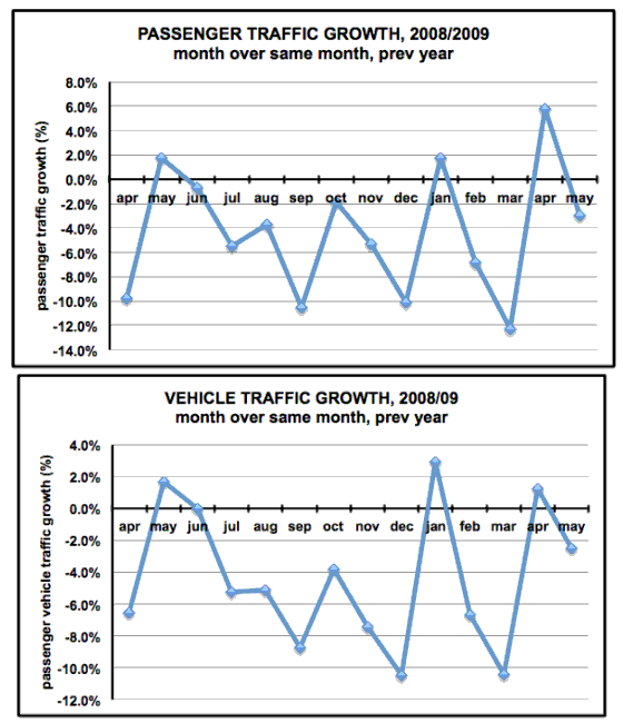 Graphs 1 a) and b) indicate that while traffic had been drifting slowly downward, it dropped precipitously through the current fiscal year, April 2008 to March 2009. In fact, passenger traffic dropped over a million (1,061,000) passengers while the vehicle decline was over half a million (512,000) vehicles, excluding buses and commercial traffic, compared to the previous fiscal year.