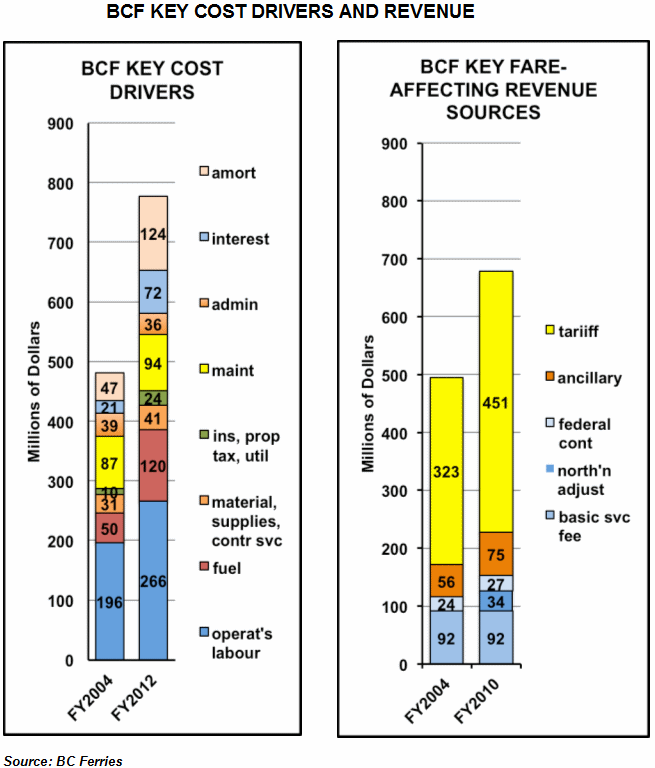 The graph of cost drivers shows BC Ferries’ major expenses, and their change from 2004 to 2012