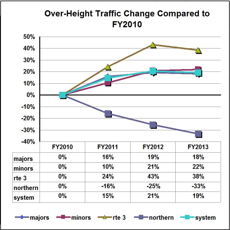 • Fare rollback Fund a 25% rollback on non-major routes and Route 3, which saw the prohibitive fare increases of the past decade. The rollback is needed to bring fares closer to inflation of that period and begin to repair the damage from the fare increases, which includes depressed ferry traffic. The link between fares and traffic is not just the view of “some ferry users” as stated; it is an almost unanimous view of users. Among the evidence: simultaneous fare growth and traffic decline from 2005 on non-major routes; traffic during the Province-funded fare reduction pilot in Dec08-Jan09; overheight traffic increase with overheight fares reductions on most routes. There is also evidence from other ferry systems. Our recommendation of the 25% level arises from the experience of overheight fares and traffic. Overheight fares decreased in 2010 by roughly 35% for all routes except northern routes. The reductions produced sustained traffic increases, as shown in the graph below. The northern routes, with no fare reductions, had traffic declines. If a 35% fare reduction results in a 20% traffic increase, it is reasonable and conservative to assume that a 25% fare reduction will produce a 10% traffic increase. It could well be more.