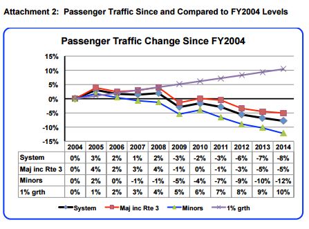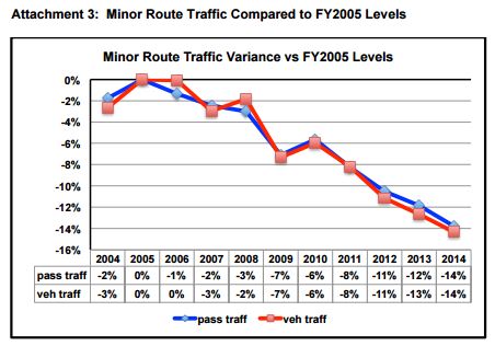 Zeroing in on Minor route traffic since its peak in FY2005 (Attachment 3), it’s clear the trend has been steadily down as fares went steadily up. The drop was more abrupt in FY2009, thanks to global economic difficulties, together with the imposition of an 18% fuel surcharge Aug 1, 2008, which brought traffic to a screeching halt in what is usually the highest traffic month of the year. Minor route traffic recovered somewhat the following year, returning to its previously established downward path. Given the constancy of the trend line, there is little reason to expect it to change dramatically in the absence of a significant resetting of fares.