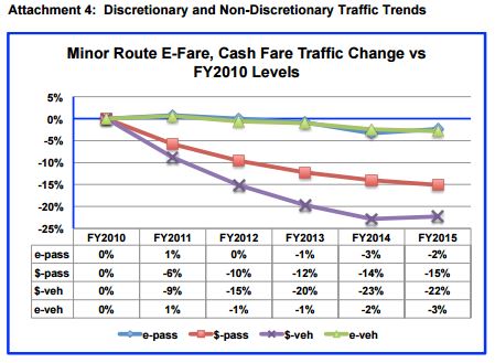 There are some who have watched the average fare decrease as the percentage of minor route E-Card travel increased. The explanation we’ve been offered is that local residents who’d been paying cash were migrating to E-Cards as fares increased, causing increases in E-Card travel. In fact, as Attachment 4 illustrates, E-Traffic has been slowly declining, while the cash fare traffic has been dramatically dropping. The former reflects non-discretionary traffic; the latter, discretionary traffic.