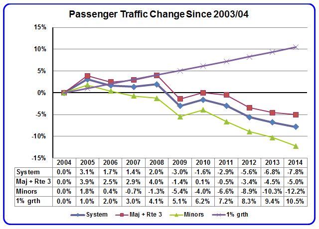 | Note the comparison to what a modest 1% traffic increase would have been. Vehicle traffic suffered similar declines. Northern routes experienced a 31% decline. | |